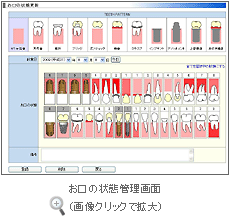 口腔内診査の結果を入力・管理できます。「Cの状態」「Pの状態」「動揺度」「EPP」「プラーク」「BOP」「分岐部病変」の7項目のデータが入力可能。従来は入力に手間取っていた口腔内診査管理を、マウスとキーボードでスムーズに行えます。